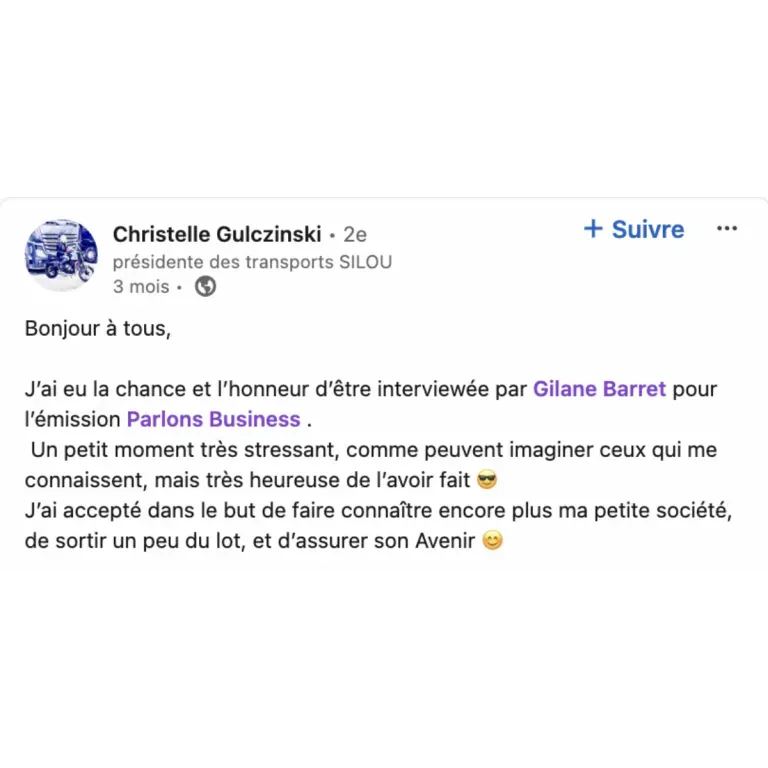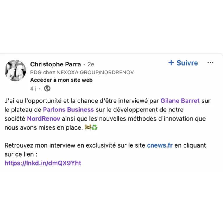 Parlons Business est partagé sur CNews.fr, avec plus de 8,2 millions de visiteurs uniques par mois sur son site, vous donnant une visibilité nationale instantanée et vous permettant de toucher une audience large et qualifiée. Votre interview est préparé sur un plateau TV professionnel, Vous aurez également accès à la vidéo pour la partager sur vos propres réseaux sociaux.